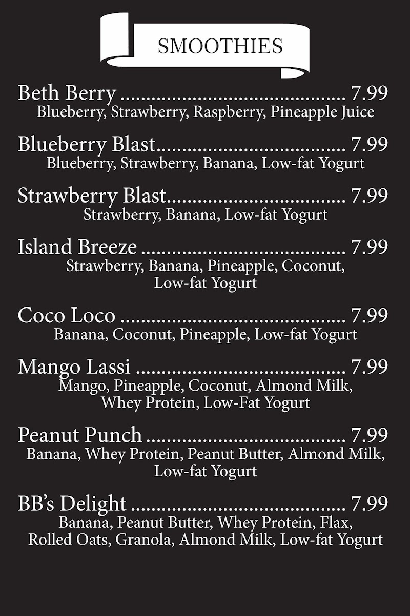 Banana, peanut butter, whey protein, flax, rolled oats, granola, almond milk, and low-fat yogurt.