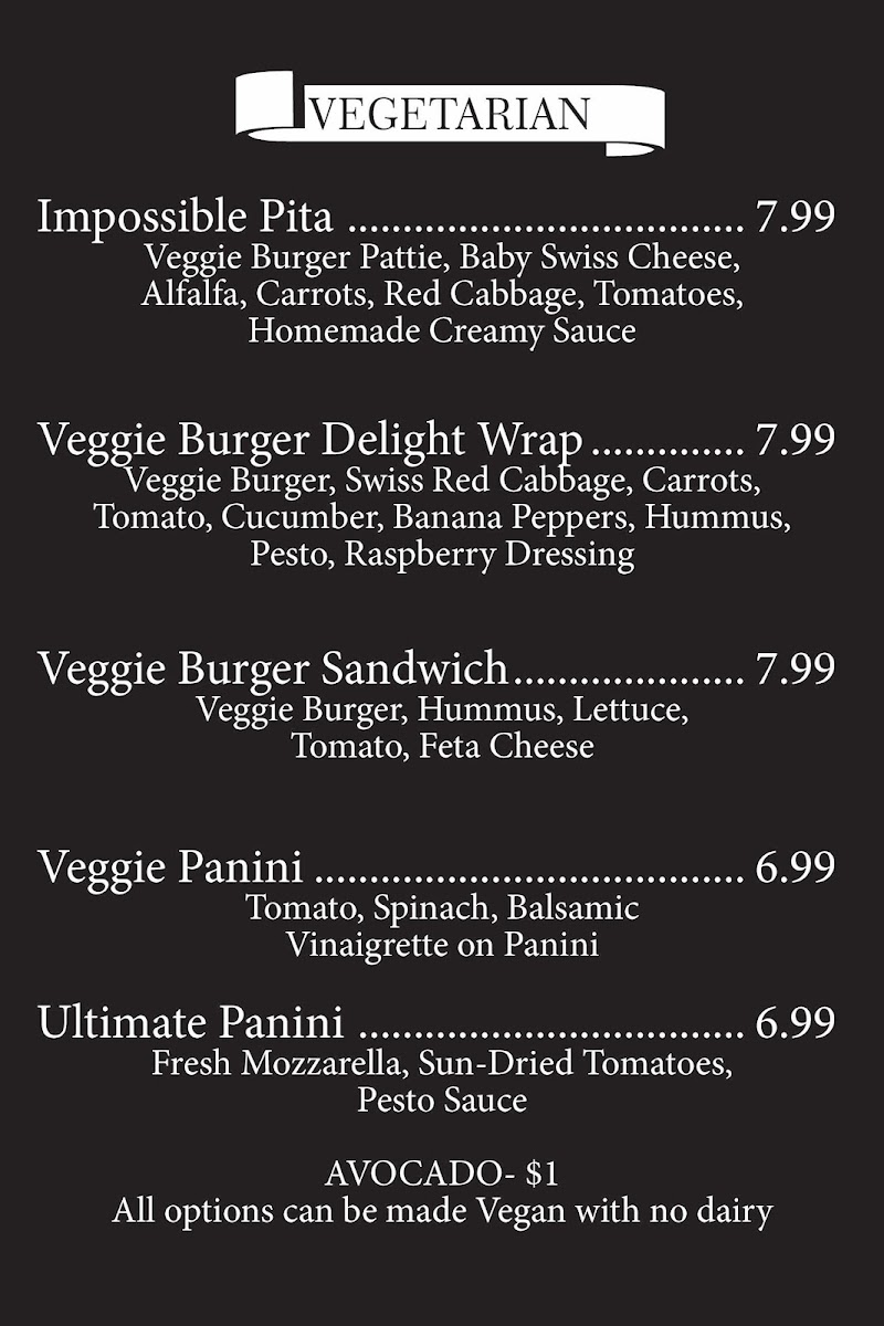 Veggie burger, Swiss, red cabbage, carrots, tomato, cucumber, banana peppers, hummus, pesto, and raspberry dressing.